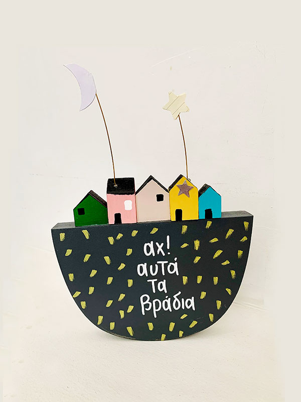 Ξύλινο χειροποίητο καράβι με πόλη «Αχ αυτά τα βράδια». Το μήνυμα αναγράφεται και στο πίσω μέρος επάνω στα σπιτάκια. Δημιουργία του Συνεταιρισμού «Πυξίδα»